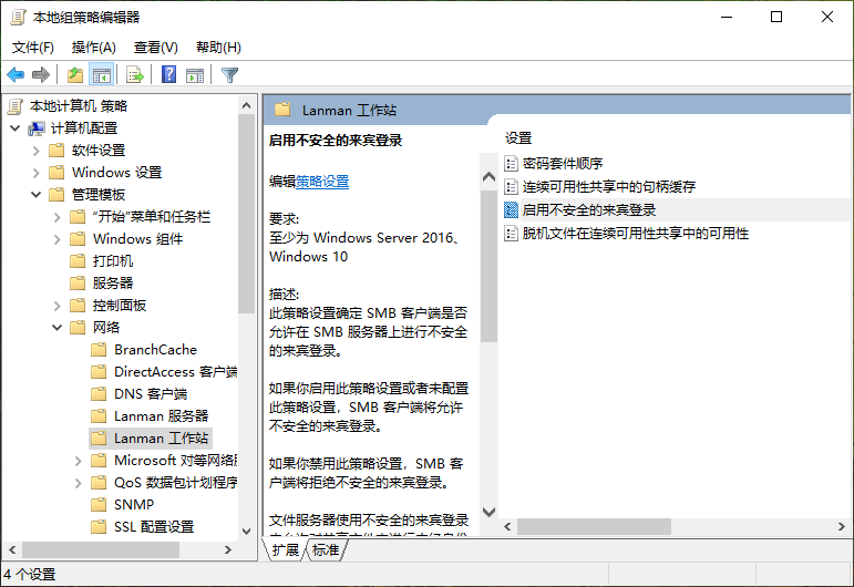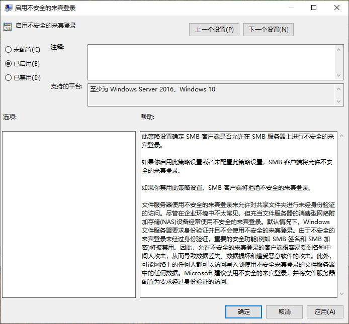 双击“启用不安全的来宾登陆”,在弹出的对话框中点击启用,再点击确定就可以了。